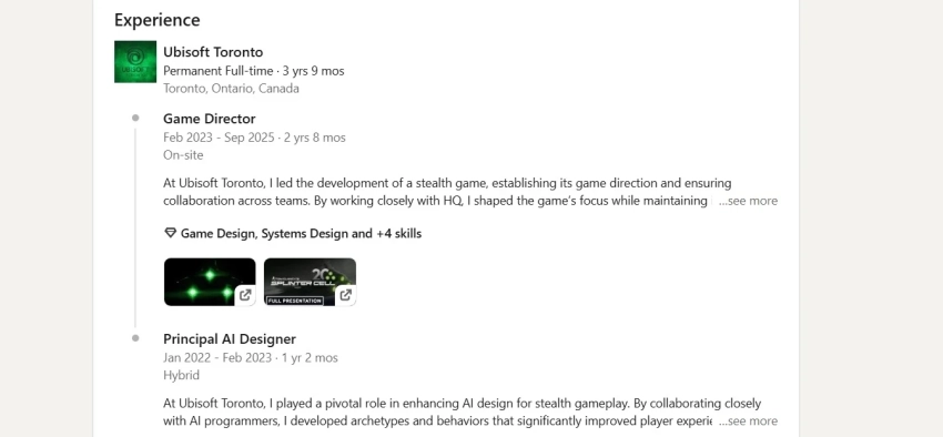 С 2023 года геймдиректором Splinter Cell Remake была главная ИИ-дизайнер Андреа Шмолл (в прошлом системный дизайнер Far Cry 6). Похоже, что в сентябре 2025 года она оставила пост, после чего Ubisoft вновь открыла вакансию. И так она воссоединилась с Гривелом.