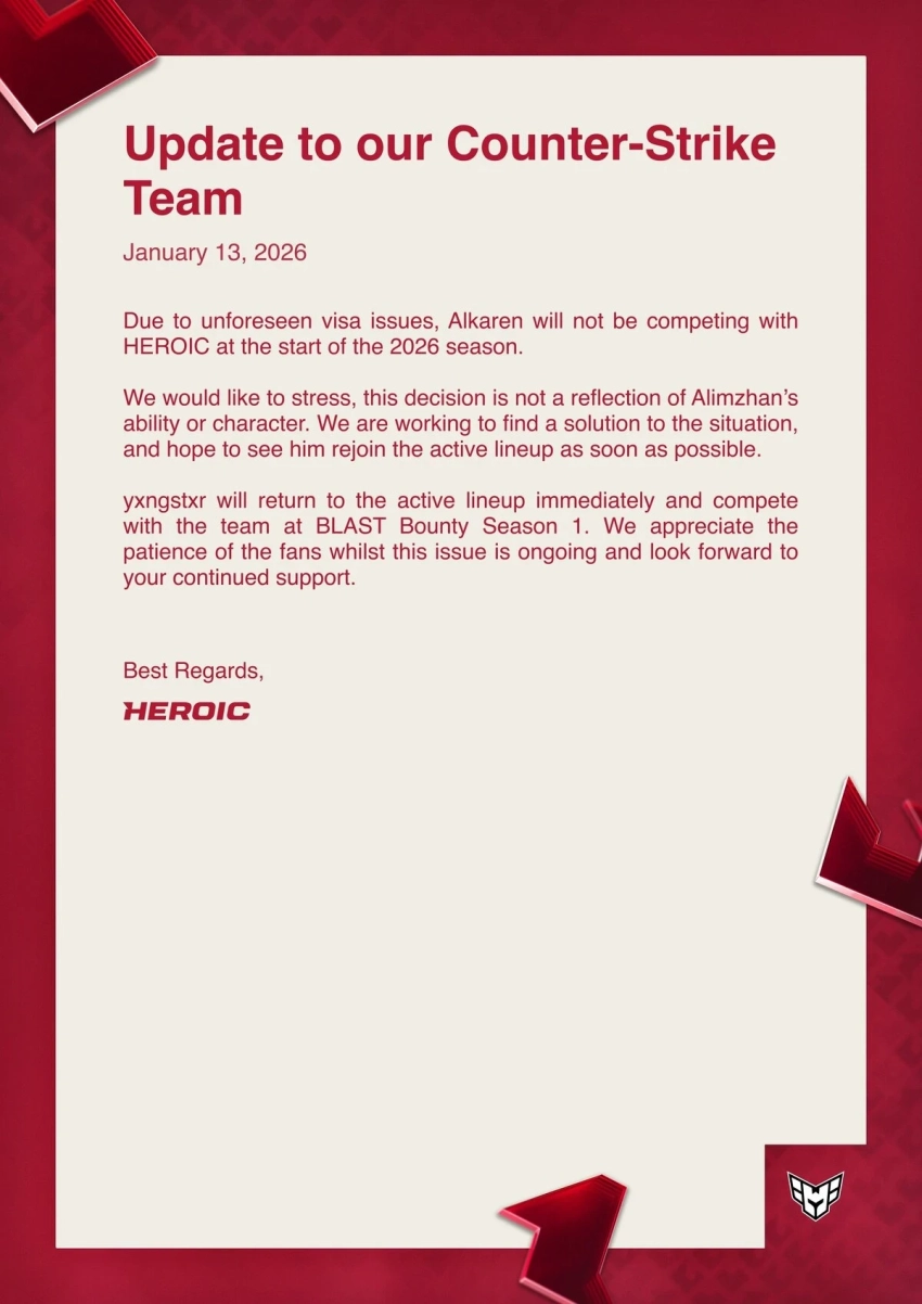 Согласно заявлению клуба в соцсети, причиной отсутствия игрока стали «непредвиденные проблемы с визами». Менеджмент организации особо подчеркнул, что эта ситуация никак не связана с игровыми показателями или поведением киберспортсмена.