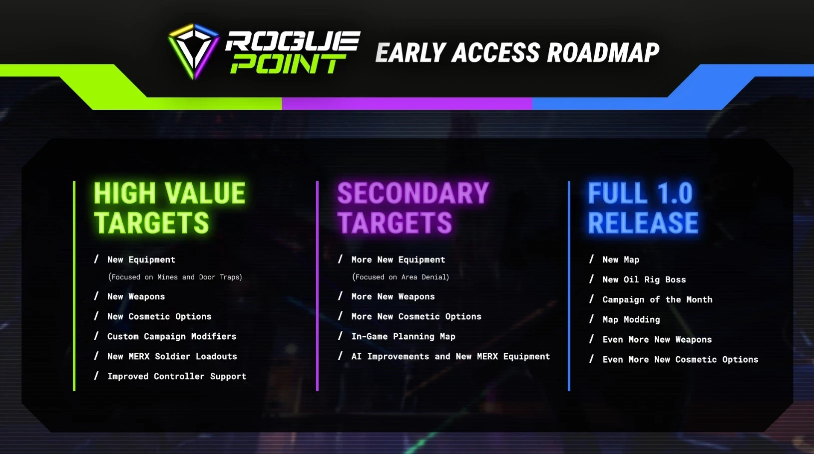 Тем временем разработчики из Crowbar Collective поделились дорожной картой развития Rogue Point в раннем доступе. Акцент сделают на новых видах оружия, снаряжении, кастомизации и модификаторах для повышения реиграбельности. К второстепенным целям относят улучшение ИИ. А вот от релизной версии стоит ждать новую карту и поддержку фанатских уровней.