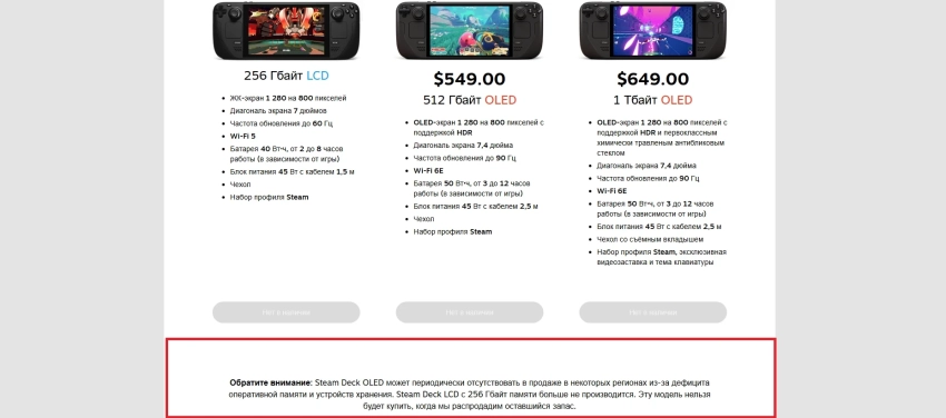 «Обратите внимание: Steam Deck OLED может периодически отсутствовать в продаже в некоторых регионах из-за дефицита оперативной памяти и устройств хранения. Steam Deck LCD с 256 Гбайт памяти больше не производится. Эту модель нельзя будет купить, когда мы распродадим оставшийся запас».