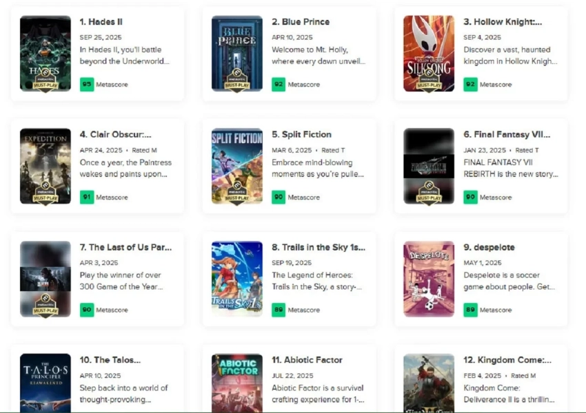 Например, на втором месте идёт головоломка Blue Prince с 92 баллами. А троицу лидеров замыкает Hollow Knight: Silksong. Что касается Clair Obscur: Expedition 33, то она расположилась на четвёртой строчке с 91 баллом.